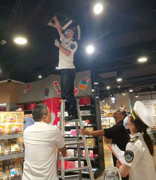 上海虹口,执法人员对中央空调进行例行检查。