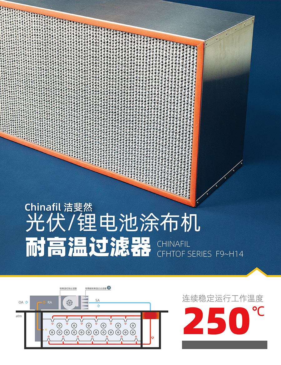 光伏产线及动力锂电池产线的涂布物料干燥工序是传热和传质相结合的过程:热空气对物料加热升温,物料表面液体蒸发汽化、内部液体通过孔隙扩散到表面蒸发。因此,极片干燥对温度、分压、洁净度要求极其严苛,球盟会涂布机专用耐高温过滤器在250℃高温工况下具备可靠的稳定性,瞬时耐温可达300℃。