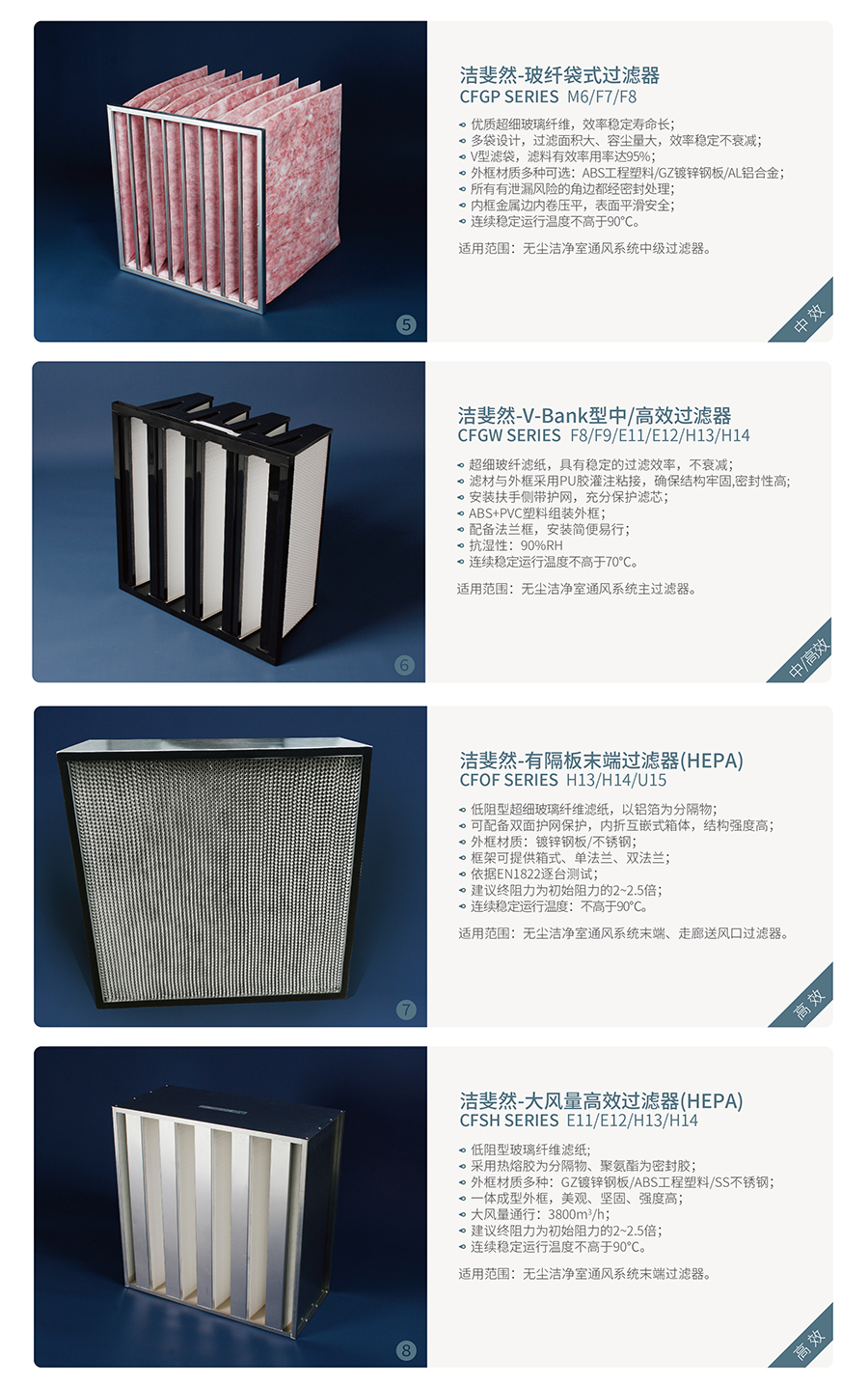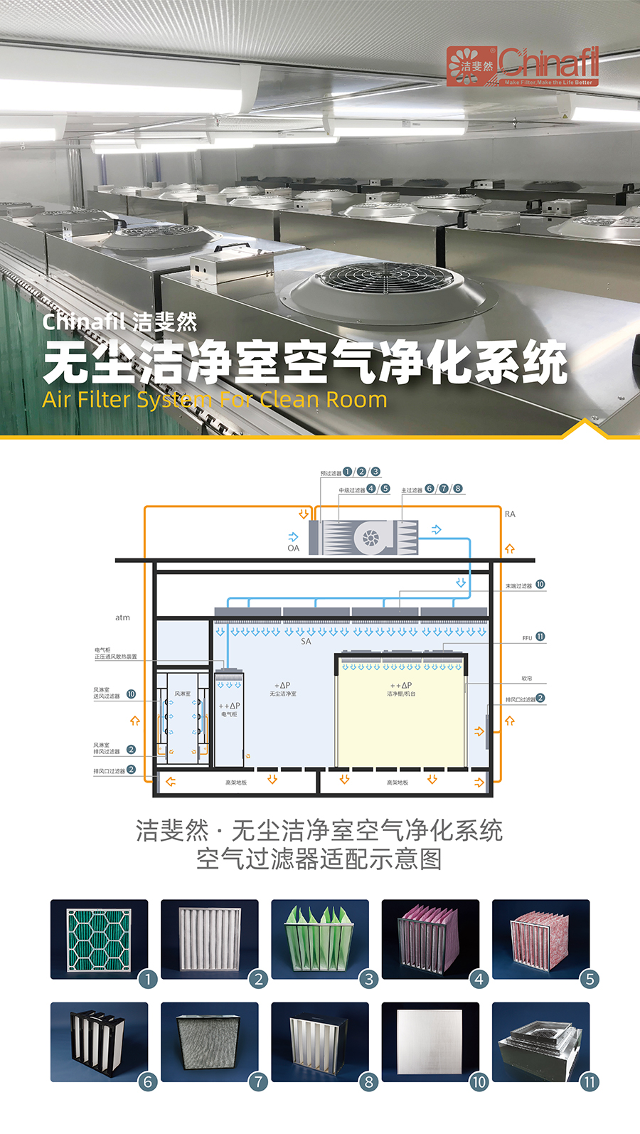 “球盟会无尘洁净室空气净化系统”可针对不同洁净等级需求的空间提供相应的通风净化解决方案,包括前端空调通风系统空气过滤、末端高效过滤器、洁净棚、微环境、机台FFU等多级空气过滤(如图中❶❷❸❹❺❻❼❽所示)。