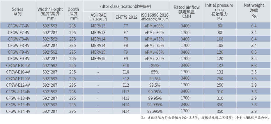 W”型(V-BANK)玻璃纤维过滤器——CFGW,采用V型结构设计,增大通风量的同时提高了容尘量,提高了滤网使用寿命;空气过滤效率涵盖F7-H14中、高两个过滤等级;因过滤效率稳定可靠、适用性强、使用寿命长等优点,广泛应用在各类型的送风系统中,承担着主过滤器的重任。
